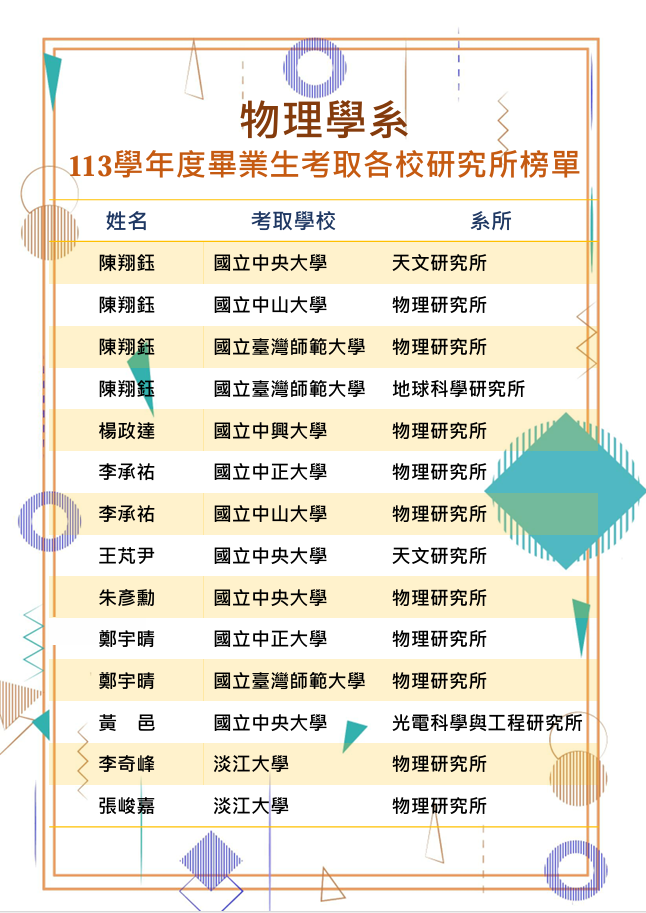 淡江物理畢業生考取研究所榜單