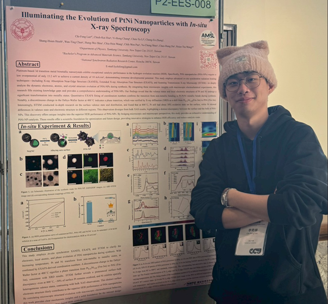 其中,李奇峰同學以奈米顆粒材料在不同反應條件下的結構演變為研究核心,在新興能源科學組中獲得壁報佳作。他坦言,能在競爭激烈的評選中獲獎,對自己而言是一種重要的鼓勵,也代表研究想法與表達方式獲得專業社群的認可。張億宏同學則聚焦於單原子催化系統,深入探討其在不同反應條件下的結構與性能關聯,成為唯一一位來自私立大學獲得壁報優等獎。他分享,這項研究在初期其實面臨不少挑戰,包含數據一致性與物理詮釋的反覆修正,但正是在一次次討論與修正中,研究脈絡才逐漸清晰。