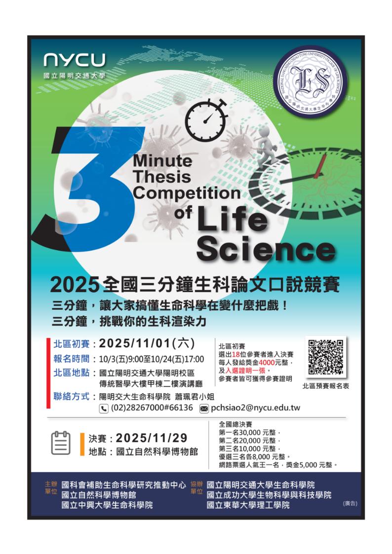一、國家科學及技術委員會生命科學研究推動中心為推廣生物科學與科技研究、培養生科人員跨領域溝通的能力,特舉辦「全國三分鐘生科論文口說競賽」,期望透過競賽促進學生彼此切磋與成長。各區預賽由國立陽明交通大學、國立中興大學、國立成功大學及國立東華大學承辦,本校生命科學院為北區預賽承辦單位。